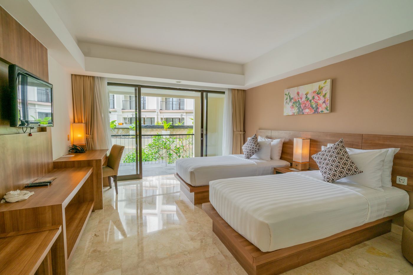 Our deluxe 4-star hotel in Kuta Bali offers 175 carefully designed guestrooms with modern furnishings, complimentary Wi-Fi, and a variety of room options such as Superior, Superior Pool View, Duplex Room, Junior Suite, Deluxe Pool, and Deluxe Pool Suites. Each room is equipped with a large LCD TV, IDD phone, work desk, in-room safe, kitchenette, microwave, mini fridge, hair dryer, tea & coffee bags, and electric kettle.